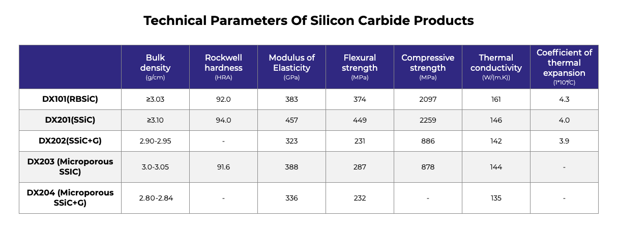 To learn more about the material, please click (More)Technical Parameters of Silicon Carbide ProductsSpecial Instructions:The information provided in this table is for general material performance reference only. Customers should be aware that the exact characteristics of the material may vary depending on the product configuration, but if specified, the value of most characteristics can be closely controlled. Nothing in this document is provided or interpreted as absolute engineering data or constitutes a guarantee or statement. Please contact Dongxin for cost-effective design, development and manufacturing assistance.